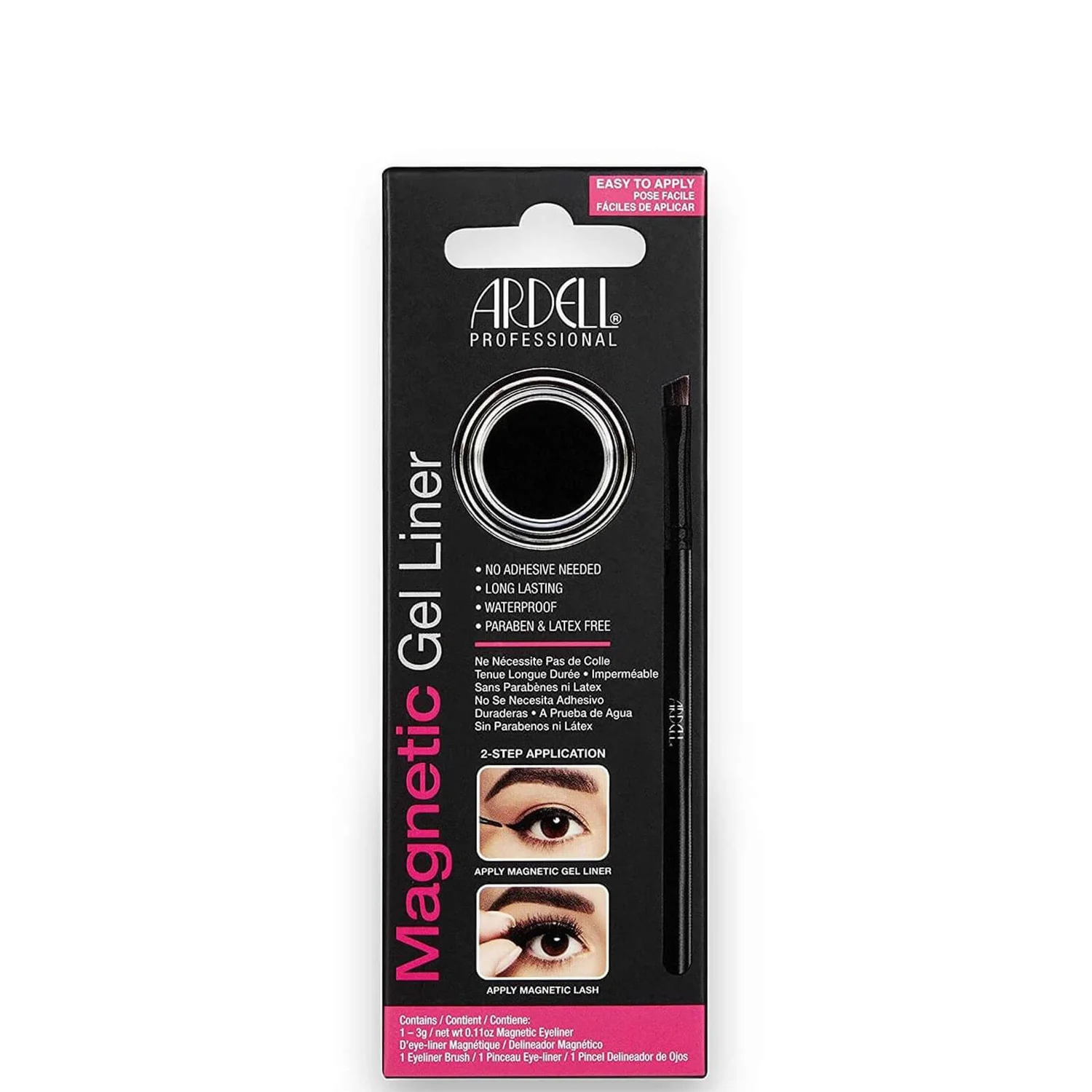 | Directions | Application: Apply two coats of Magnetic Gel Liner along the upper lash line. Place Magnetic Lashes on Magnetic Gel Liner while liner is still semi-wet. Gently press down to secure. Removal: Gently peel off Magnetic Lashes and remove Magnetic Gel LIner residue from the band/magnets, taking care not to detach magnets from band. Store in tray for reuse. To remove Magnetic Gel Liner, gently wipe an oil-based makeup remover over closed eyelids until clean. Quick Tips: Apply on clean & dry lids. For best results, use primer prior to application. If you need to re-position Magnetic Lashes once the Magnetic Gel Liner has dried, slowly peel off lashes and gently remove any Magnetic Gel Liner from band/magnets, taking care not to detach magnets from the lash band. Reapply fresh coats of Magnetic Gel Liner before reattaching Magnetic Lashes. |