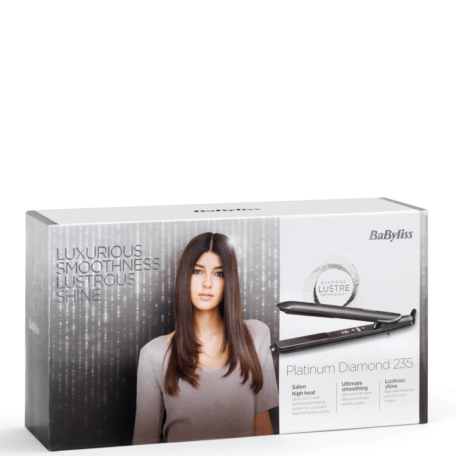 Sculpt smooth styles, flicks and waves with the BaByliss Platinum Diamond 235 Straightener. Diamond infused ceramic plates ensure sleek results, which are longer for faster styling. The high heat performance can reach up to 235°C, with three heat settings to personalise the straighteners to your hair type. Advanced Ceramics maintain the high heat and help the plates to heat up quickly, making them ready to use in 15 seconds. To keep you safe, they come with an auto shut-off safety setting, a heat protection wrap and 3m swivel cord for easy use.